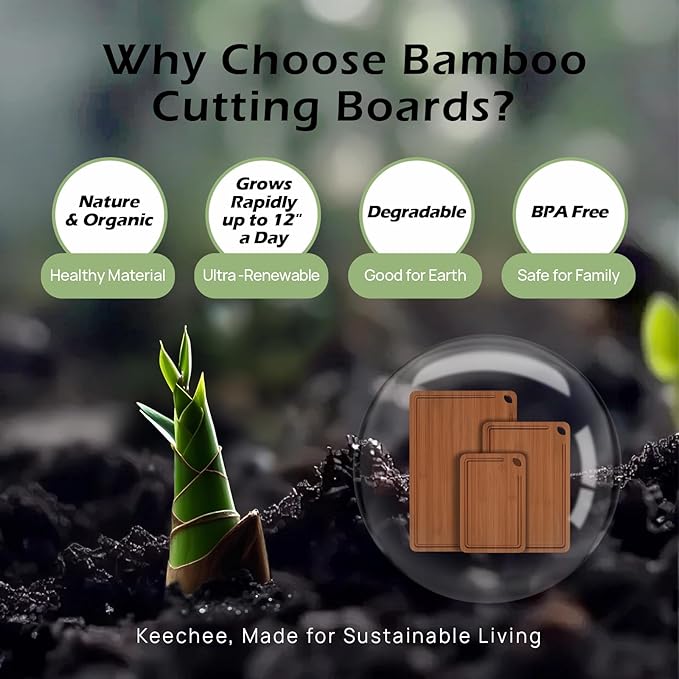 • 𝐁𝐞𝐧𝐞𝐟𝐢𝐭 𝐎𝐮𝐫 𝐇𝐨𝐦𝐞 – Keechee’s cutting board set is crafted from sustainably harvested quality bamboo forests(Bamboo grows quickly and a single bamboo can be harvested multiple times). Known for its natural strength and eco-friendliness, our bamboo provides a durable and environmentally responsible choice for your kitchen.
