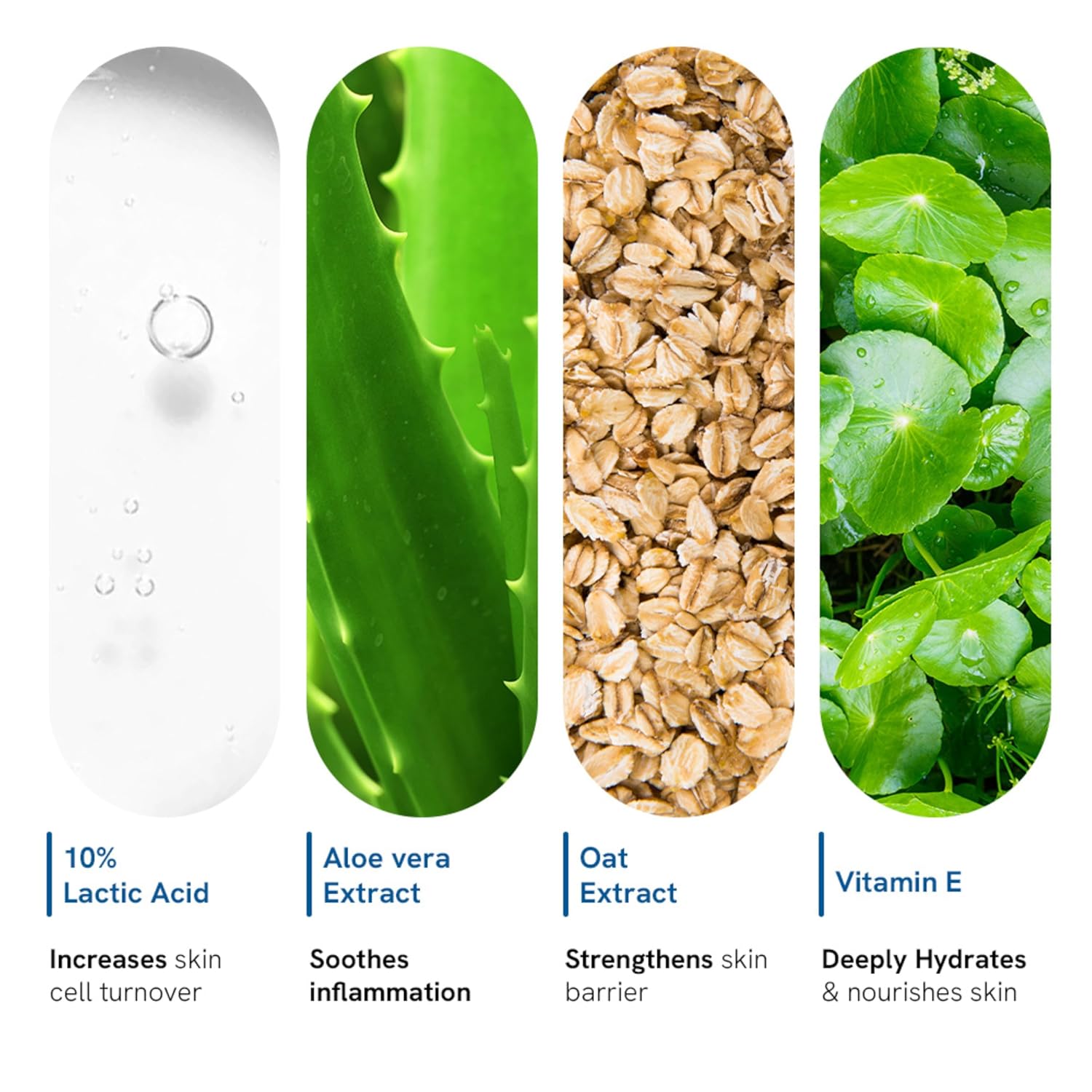 EXFOLIATING & MOISTURIZING BODY SCRUB: 10% AHA body scrub comes in an easy-to-use hygienic packaging, gently exfoliates without stripping off moisture from the skin & detans skin. Regular use helps reduces ingrown hair, & tan. IMPROVES APPEARANCE OF CELLULITE & SKIN TEXTURE: With jojoba beads & 10% lactic acid, this body scrub reduces cellulite, keratosis pilaris & chicken skin. Regular scrub massages can assist lymphatic drainage and stretch skin tissue to improve cellulite appearance. DE-TANS SKIN: Oat extract in this body scrub acts as a gentle exfoliating agent that removes trapped dirt, oil, and dead skin & hence, reveals brighter-looking skin HYDRATES & MOISTURISES: Centella water & aloe vera extract with its anti-inflammatory properties help calm irritated skin, provides intense hydration & moisturize skin. HOW TO USE: Apply a generous amount of scrub on wet skin and scrub in circular motions. Rinse off & pat dry. Use generous amount on neck, elbows, knees, underarms & feet