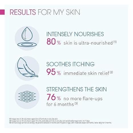 The exclusive lipigenium complex, composed of biolipids naturally found in the epidermis, durably reconstructs the skin barrier by biologically stimulating the synthesis of lipids and proteins that make up the intercorneocyte cement. The anti-pruritus dermatological agent pea rapidly relieves itching and reduces the urge to scratch. The skin barrier therapy patent prevents the adhesion of bacteria that cause irritation on even the driest skin.