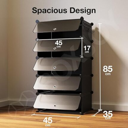 BOXJOY 5 Shelf Shoe Rack with Door Magnets & 5Hook Steel Holder for Home Storage PP Plastic Box Organizer with Metal Door Frame, Chappal Slipper Sandals Stand (Black)